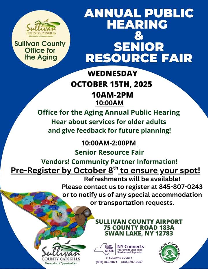 Swan Lake, NY – Sullivan County’s Office for the Aging warmly invites the community to attend its Annual Public Hearing and Senior Resource Fair on October 15, to be held at the brand new Terminal at Sullivan County International Airport off County Route 183 (Airport Road) near Swan Lake.
